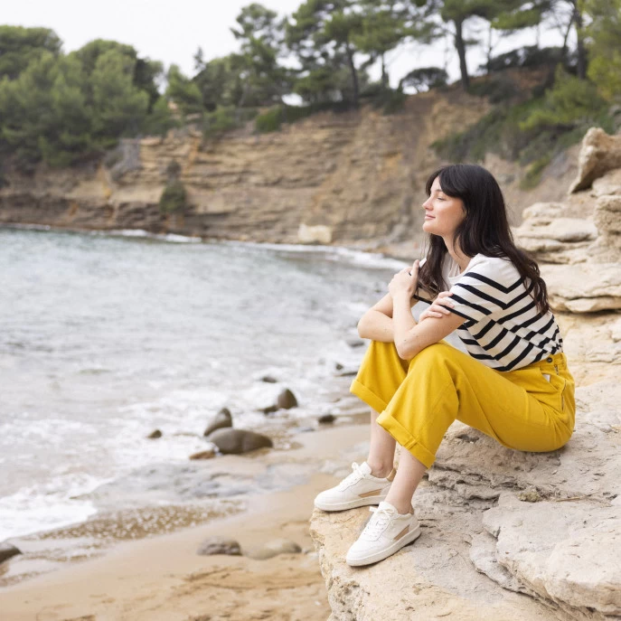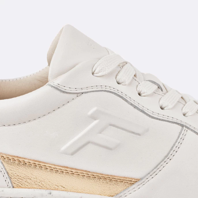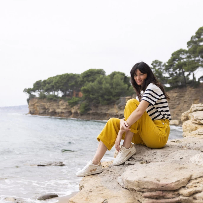 La ALDER crème et dorée est une basket en cuir citadine et innovante, fabriquée au Portugal. Sa semelle en caoutchouc synthétique recyclé contient des balles de tennis recyclées, récoltées dans des clubs de tennis près de Porto. Sa doublure en microfibre thermorégulatrice et sa semelle intérieure en mousse recyclée et liège sont un gage de confort. Faciles à porter et à assortir au quotidien les Alder réhausseront un look intemporel