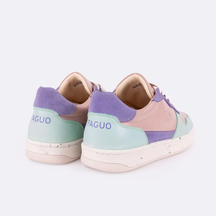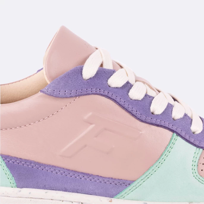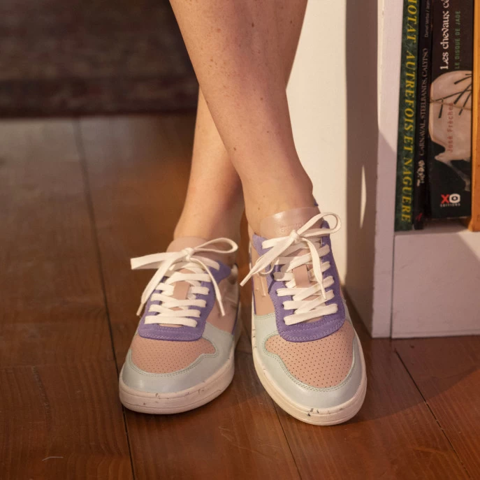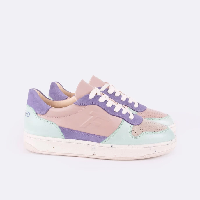 La ALDER rose & menthe est une basket en cuir citadine et innovante, fabriquée au Portugal. Sa semelle en caoutchouc synthétique recyclé contient des balles de tennis recyclées, récoltées dans des clubs de tennis près de Porto. Sa doublure en microfibre thermorégulatrice et sa semelle intérieure en mousse recyclée et liège sont un gage de confort. Faciles à porter et à assortir au quotidien les Alder réhausseront un look intemporel