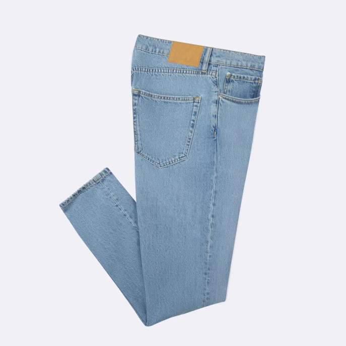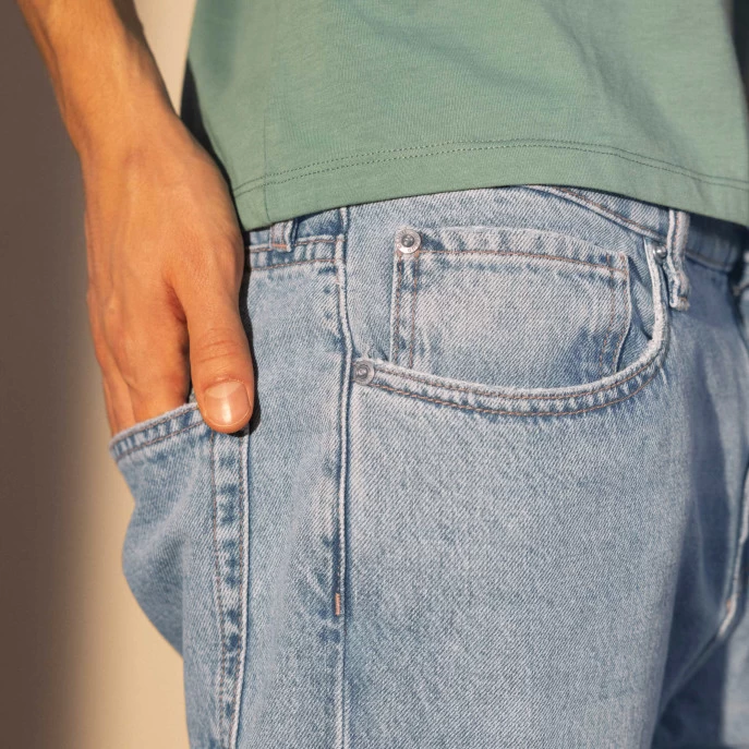 Les jeans FAGUO sont l’aboutissement d’un projet circulaire depuis sa matière première jusqu’au produit fini. Pour réduire son impact carbone, ses matières recyclées proviennent de chutes industrielles réutilisées. Les boutons et rivets sont amovibles pour pouvoir recycler facilement ce jean.