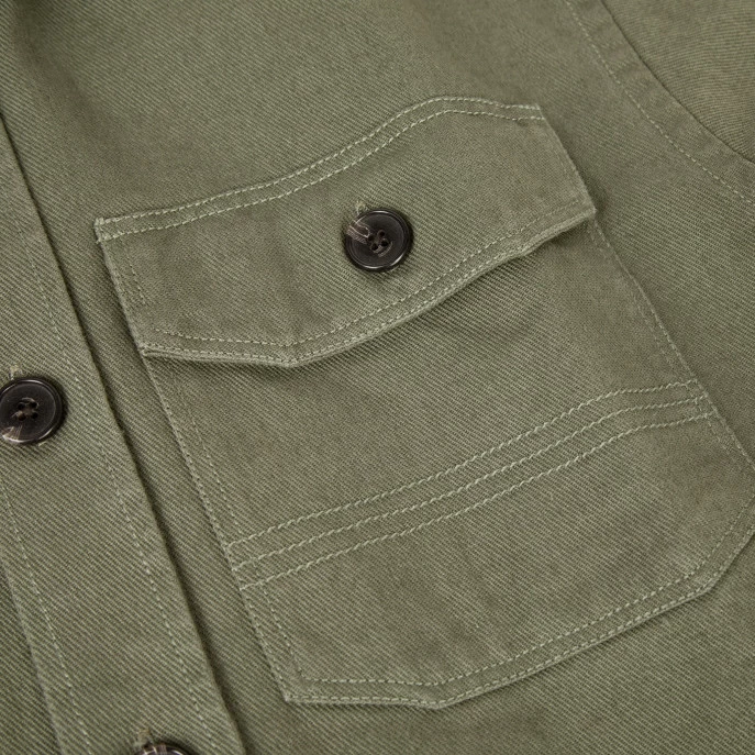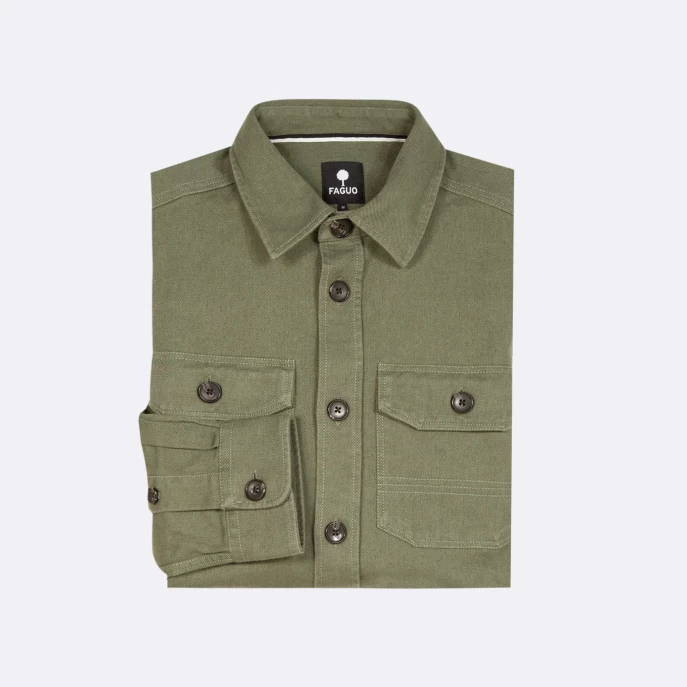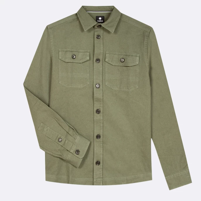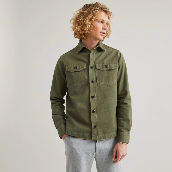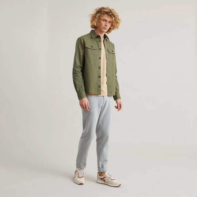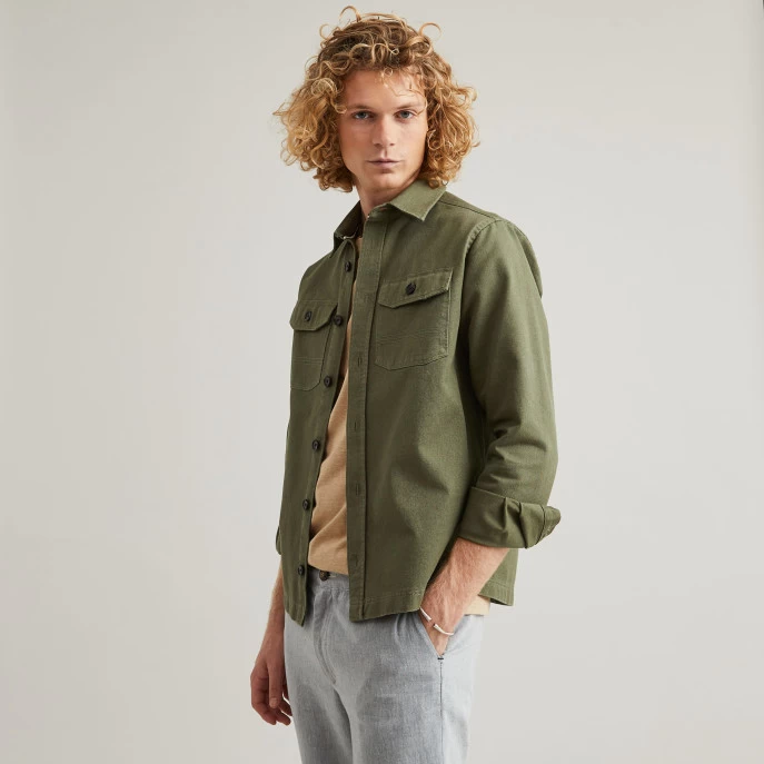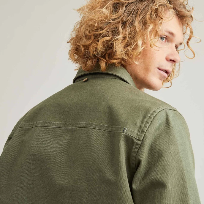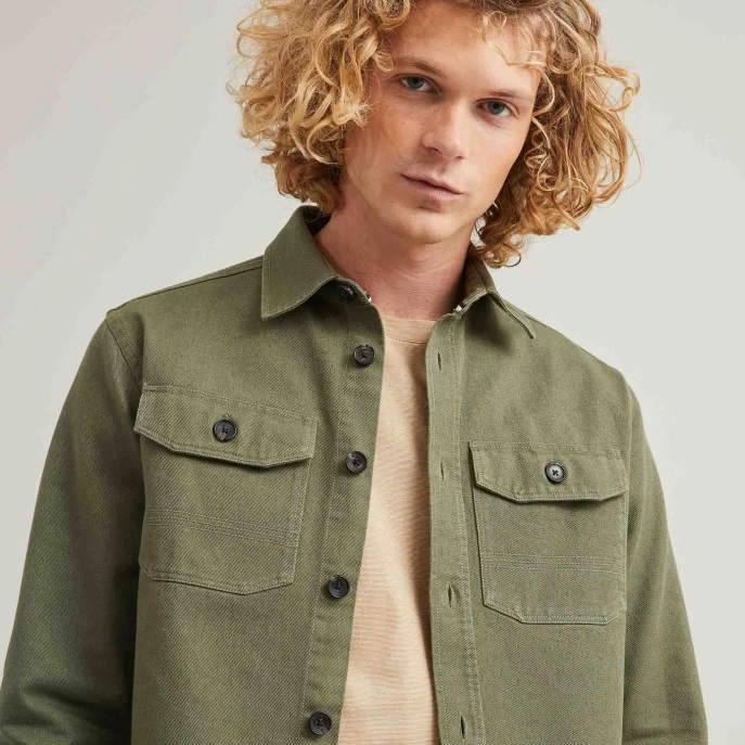 La sur-chemise CÉRILLY kaki détourne les codes du « workwear » avec ses poches boutonnées et en reprenant les détails de sur-piqûres. Multi-usage avec sa couple ample, elle peut-être portée comme une veste ou comme une chemise. Un vrai hybride qu’on ne quitte plus pour profiter de la ville ou d’une balade en forêt.