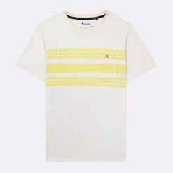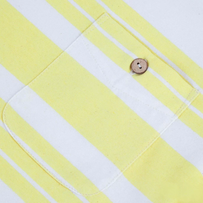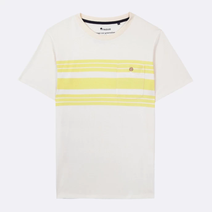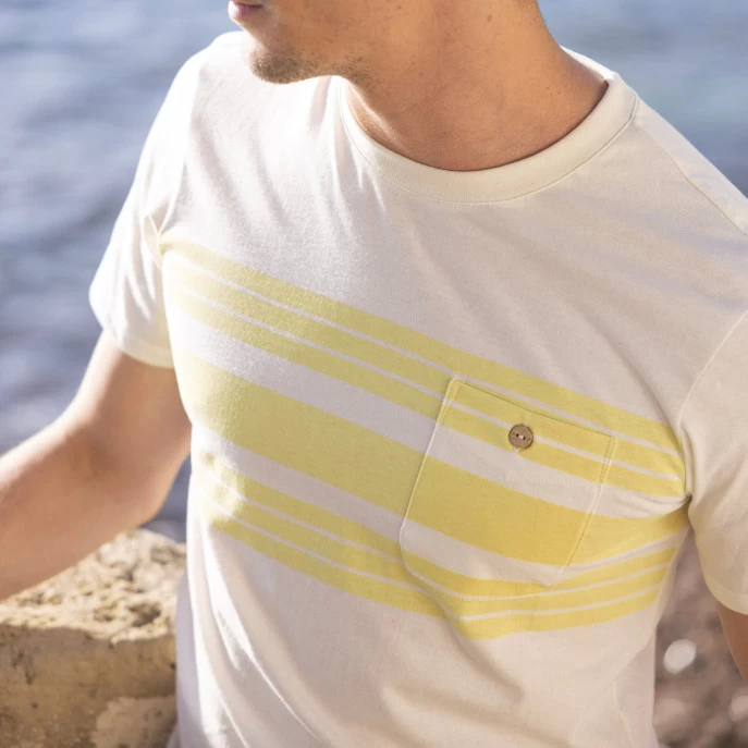 Le t-shirt OLONNE beige & jaune, à col rond, a été pensé par notre studio comme un incontournable du vestiaire, avec sa poche poitrine. Sa coupe est droite et classique.