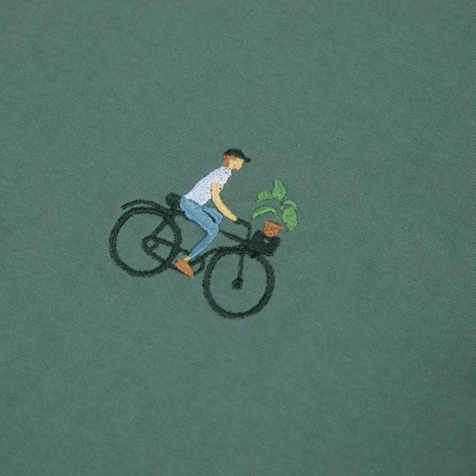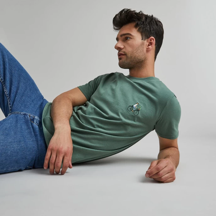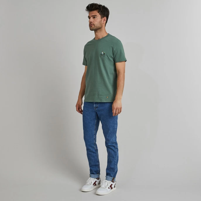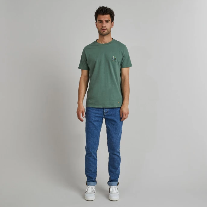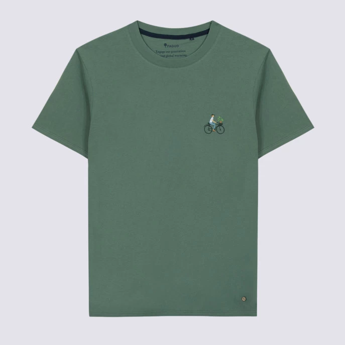 Le t-shirt ARCY vert broderie vélo, à col rond, est un modèle iconique Faguo.
